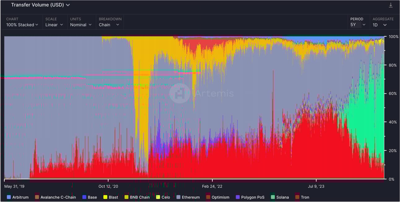 Paypal chose to move forward with Solana (neon green) because of its stablecoin dominance.