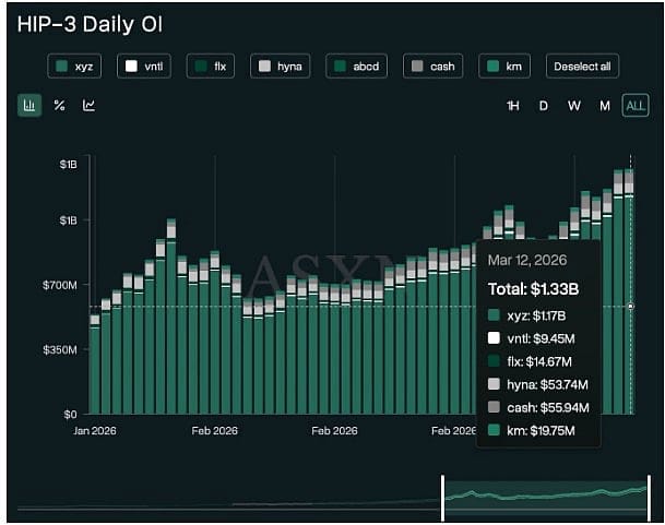 HIP-3 open interest hit a record $1.43 billion on March 17. That is a 100x increase from launch six months ago. Of the top 30 markets on the platform, only 7 are crypto pairs.