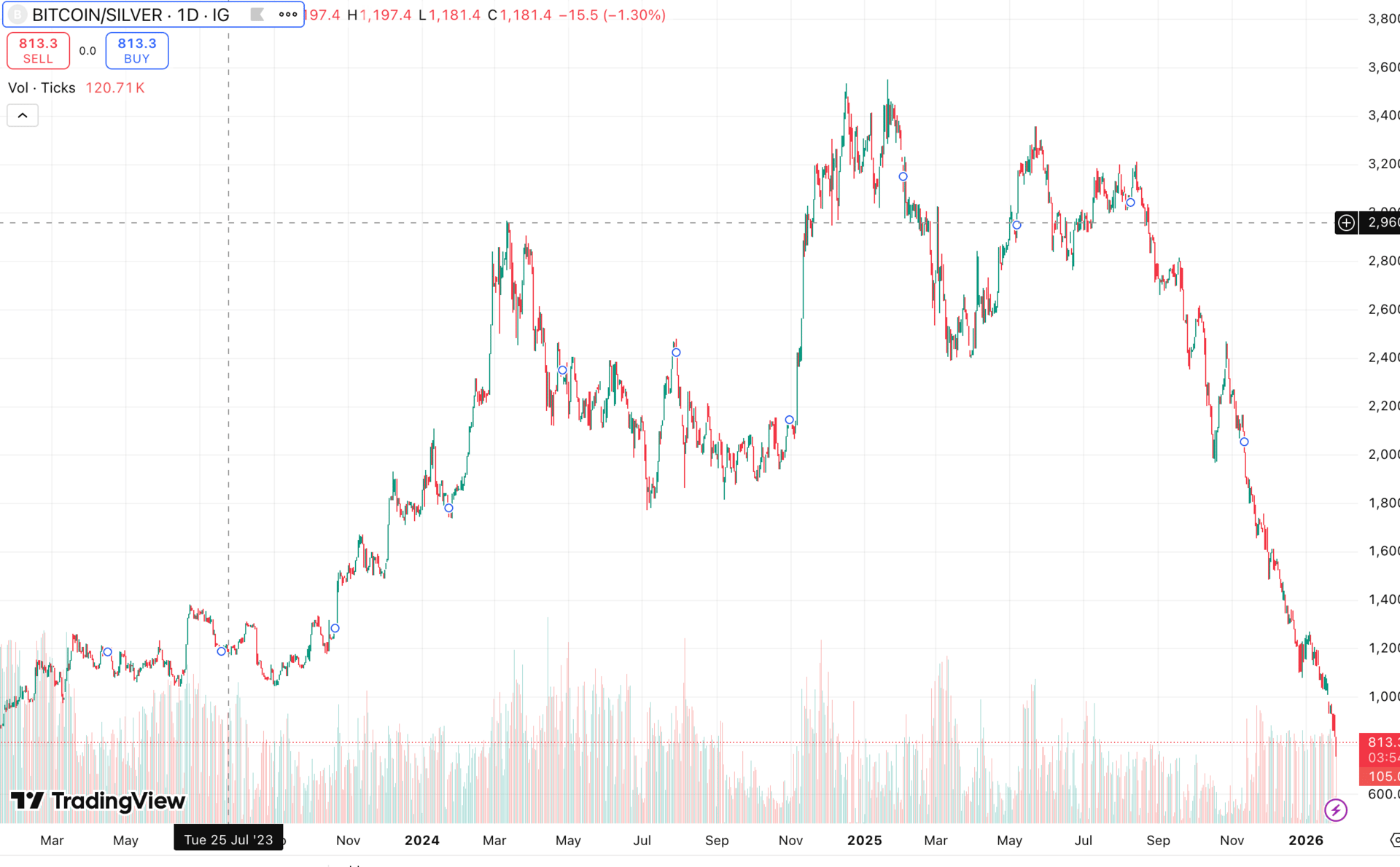 In silver terms, it's even more stark. Bitcoin has lost nearly half its purchasing power against silver since early 2024.