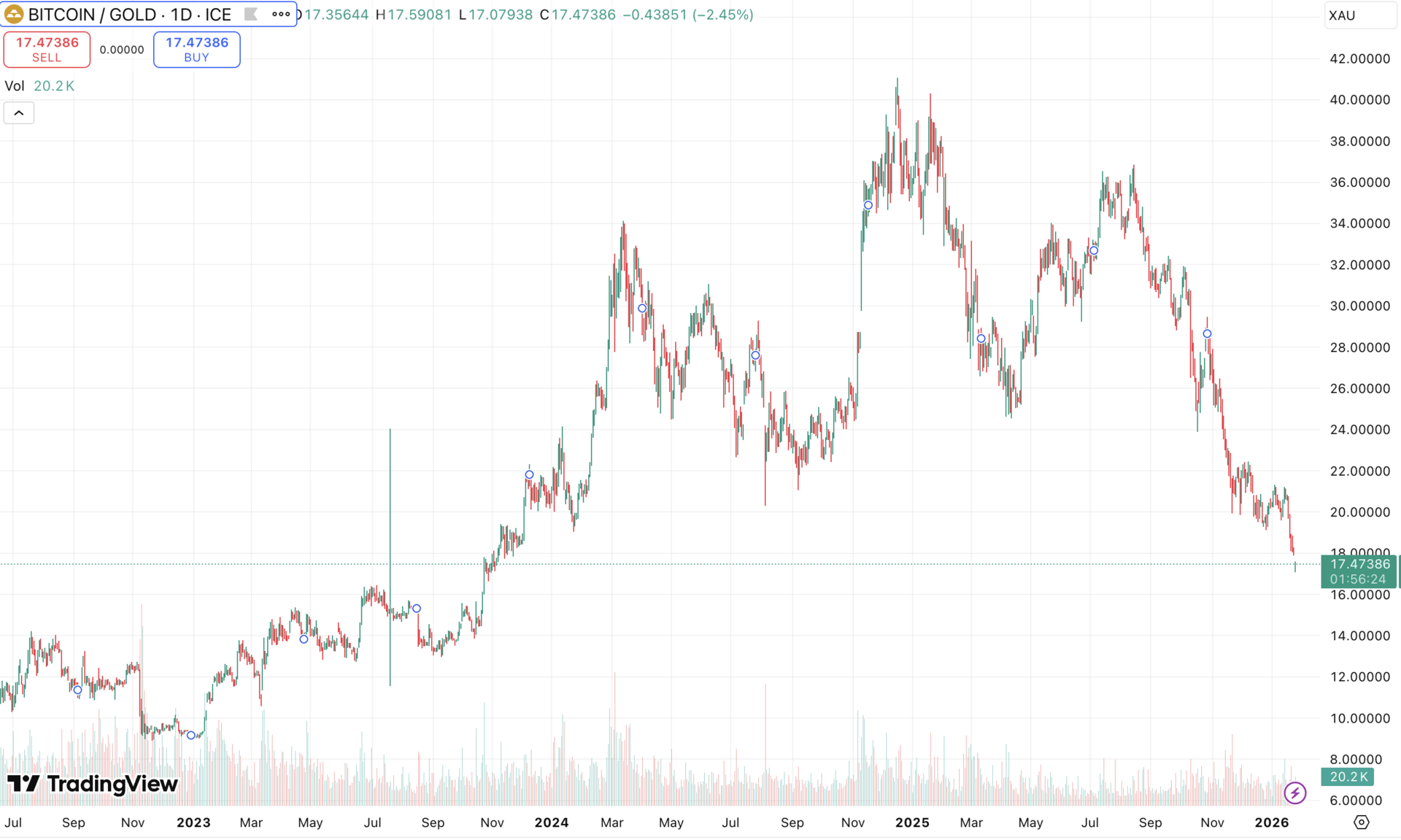 If you sell BTC now to buy gold, you're selling at an 18:1 ratio that was 31:1 just months ago. You're locking in the worst exchange rate in years.